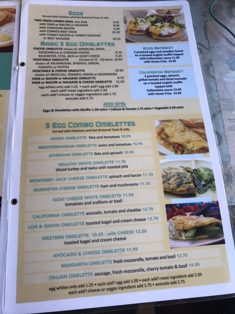 Prepared with three eggs. Served with potatoes, hot buttered toast and jelly.