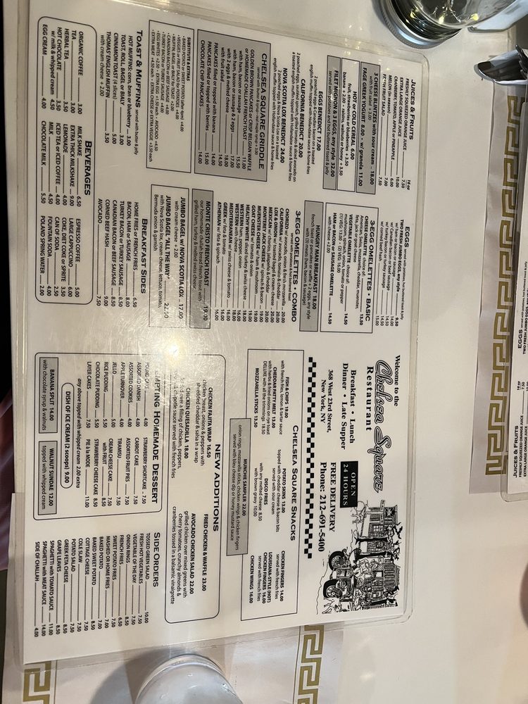 Introducing the menu at Chelsea Square Restaurant, located in New York City, where you can indulge in a selection of Diners-style dishes, perfect for Breakfast, Brunch, and even Late Night cravings. From overstuffed Egg Sandwiches to flavorful Eggs and Omelettes, there is something for everyone. Enjoy fresh-squeezed juices and fruits, along with a variety of vegetarian options. The menu also features Juices, Fruits, and Overstuffed Egg Sandwiches for those looking for a quick bite. With a casual atmosphere and friendly service, Chelsea Square Restaurant offers a range of delectable options for all meals of the day. Don't miss out on the hearty portions and cozy vibes this neighborhood cafe has to offer.